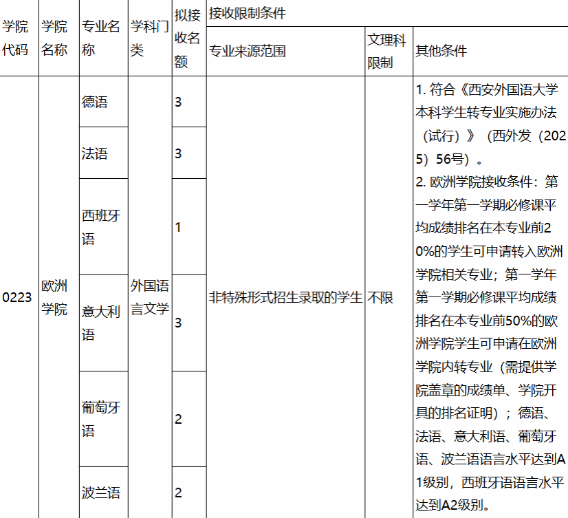 欧洲学院转出学生需符合《西安外国语大学本科学生转专业实施办法(试行)》(西外发(2025)56号)的转出条件。