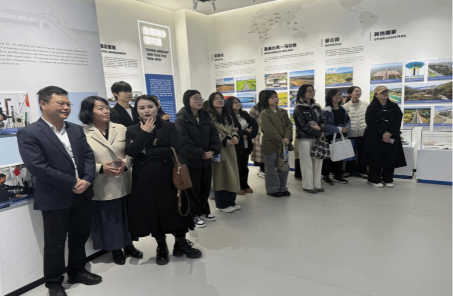 首先,工作人员带领大家参观了中铁二十局展览馆。通过一幅幅珍贵的历史图片、一件件厚重的实物展品与一座座精美的建筑模型,师生们看到了中铁二十局自成立以来,波澜壮阔的发展历程与举世瞩目的辉煌成就。展馆内陈列的众多奖章证书与地标性工程照片,不仅见证了企业“逢山凿路,遇水架桥”的铁道兵精神,也深深感染了在场的每一位参观者,让大家对中国铁建的品牌实力与文化底蕴有了更为直观和深刻的认识。